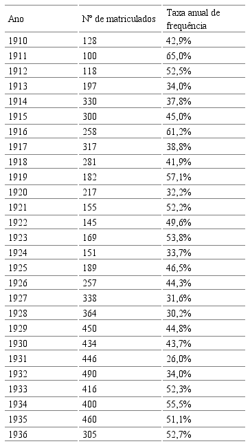 Podemos inferir pelos dados apresentados na tabela, que apesar do expressivo número de matrículas, era muito baixa a frequência desses alunos, ou seja, muitos dos que iniciavam os cursos não conseguiam permanecer matriculados, causando um grande número de desistências. Vemos, por exemplo, que no primeiro ano de funcionamento, a frequência alcançou menos de cinquenta por cento das matrículas iniciais.