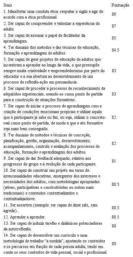 Competência ética. Esta é a competência mais pontuada pelos membros do painel, o que é revelador da enorme importância que assume no exercício do papel de educador. “Respeitar o sigilo e agir de acordo com a ética profissional” foi declaradamente expresso, o que nos remete para a importância da conduta ética estar presente, em permanência, em todos os atos educativos. Tal assume um significado acrescido quando o educador de adultos atua em situações de intimidade e privacidade, junto de pessoas e grupos vulneráveis (com trajetórias de vida difíceis, por vezes dramáticas, com frágil autoconfiança), pelo que lhe é requerido um zelo particular de “sabedoria prudencial” (BAPTISTA, 2014, p. 7) no exercício da atividade educativa e formativa, porque a ética do respeito, da integridade e da proteção da pessoa deve prevalecer em tudo o que fazemos, e perante a inexistência de um código de ética próprio, dados os frágeis processos de profissionalização do educador de adultos em Portugal e mesmo na esfera internacional, compreende-se que os membros do painel tenham colocado esta competência no topo da escala de importância.