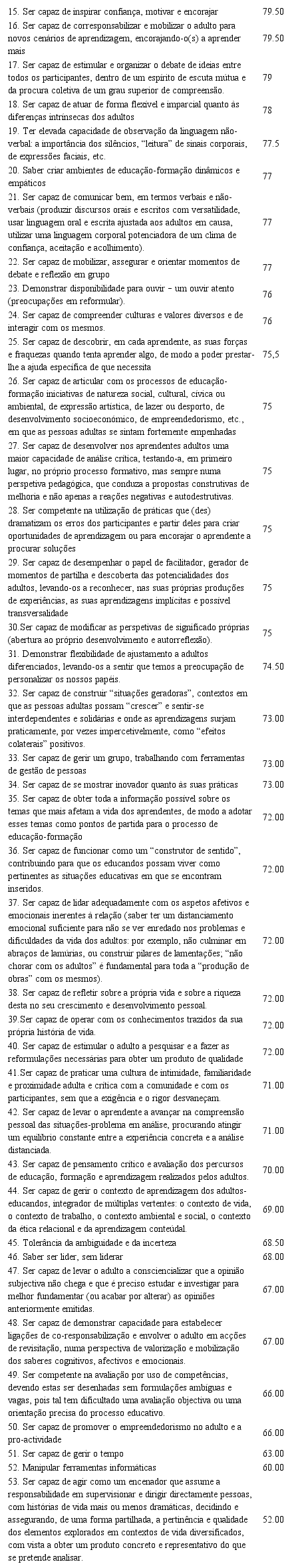 Competência de facilitação da aprendizagem. Esta é, de longe, a competência mais discriminada, associando-a os membros do painel a diferentes facetas: relacionais (criar ambientes dinâmicos e empáticos; inspirar confiança, motivar e encorajar; ser assertivo; dar feedback adequado); de personalização do processo formativo (currículo à medida, linguagem ajustada aos adultos em causa, prestar ajuda específica a cada educando); de promoção do desenvolvimento pessoal; da reflexão (organizar debates de ideias, reflexão em grupo, estimular a pesquisa e a reformulação, estudar e investigar para melhor fundamentar as opiniões); de abertura à diversidade cultural (compreender culturas e valores diversos); de liderança de grupos (de forma sutil); de construtor de sentido (situações educativas significativas); de mobilização de conhecimentos da própria história de vida; de manipulação de ferramentas informáticas. Trata-se de um papel de grande complexidade que, em geral, demarca o afastamento de transmissor de informação ou de “educação bancária”, segundo Freire, e que pode ser informado por vários posicionamentos teóricos (OLIVEIRA, 2004).
