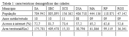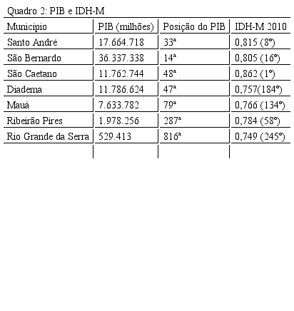 Na região do grande ABC, a população tinha, em média, mais de nove anos de estudo. No entanto, como se pode verificar na Tabela 01, a internet ainda não estava totalmente universalizada e em algumas cidades não chegava aos 55%. A Tabela 02 traz informações sobre o Produto Interno Bruto: