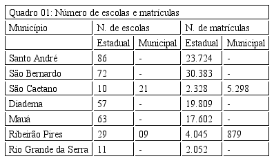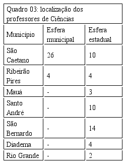 Os professores de Ciências que participaram deste estudo eram de escolas municipais e estaduais dos sete municípios da região do grande ABC. O Quadro 03 mostra os dados: