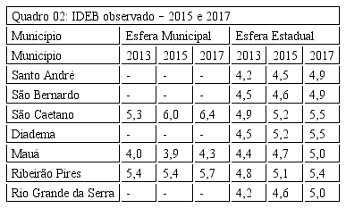 As aferições têm revelado avanços no IDEB dos municípios da região, tanto na esfera municipal como na estadual. Apesar deste crescimento ser discreto em alguns casos (Mauá esfera municipal), ele vem ocorrendo nas cidades do grande ABC Paulista. No entanto, é necessário destacar que nenhuma cidade havia superado a meta estabelecida pelo Instituto Nacional de Estudos e Pesquisas (INEP).