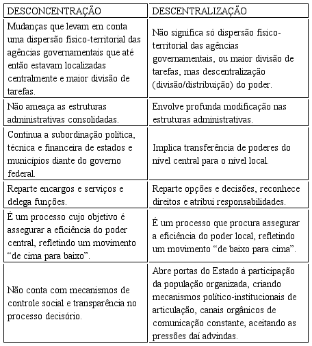 Diante disso, a descentralização pode ser entendida como uma espécie de imunização aos grupos de interesses que se serviam deste caráter para fortalecer seus pares, defender interesses nem sempre voltados para o coletivo, e, consequentemente, não discutidos em prol de um bem de todos. No cenário atual, o binômio descentralização-desconcentração aponta para nuances semelhantes aos interesses subjetivos daquele momento mencionado pela autora. Sob a definição de Antunes (2002, pp.96-97), apresentamos no quadro 1 uma proposta comparativa entre desconcentração e descentralização.