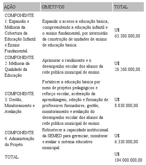 O PROEMEM, em seu objetivo geral, anuncia que pretende ampliar a cobertura e melhorar a qualidade da educação infantil e ensino fundamental da rede municipal, partindo da premissa de inclusão para quatro ações componentes. Observe o quadro abaixo detalhando a distribuição dos custos financeiros para a execução das ações dos componentes do PROEMEM: