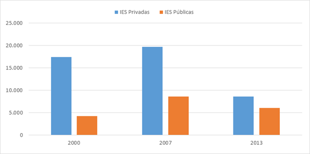 Essa tendência difere quando consideramos distintamente o universo das universidades públicas e privadas do estado. Nas universidades públicas, há um crescimento constante e sustentável dos cursos e matrículas nessas instituições, quando se trata de comparar 2000 e 2013. Aqui se evidenciam os efeitos da criação de 3 novas universidades no RS a partir do ano de 2000 (UERGS, UNIPAMPA e UFFS), a ampliação de vagas pelo REUNI em universidades públicas com a abertura de novos cursos, inclusive, no turno da noite.