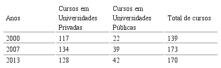 No ano de 2000 eram oferecidos 139 cursos dentre os pesquisados, destes, 15,83% estavam localizados em universidades públicas e 84,17% em universidades privadas. Em 2007 houve um acréscimo no total de cursos oferecidos, nas duas categorias administrativas. Nas universidades públicas o aumento foi bem mais significativo, 77,27% em relação a 2000, enquanto nas privadas o percentual não passou dos 14,53%.