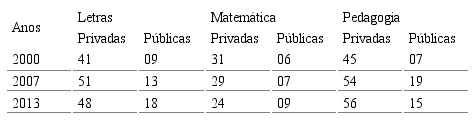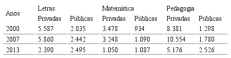 Considerando o ano de 2013, tomando como base 2007, observa-se uma queda de mais de 50% nas matrículas nos três cursos pesquisados, na rede privada. Considerando esses mesmos anos, na rede pública, observa-se um acréscimo no número de matrículas nos cursos de Letras e Pedagogia e uma constante desse número nos cursos de Licenciatura em Matemática, o que pode ser observado na tabela a seguir.