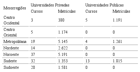 Ao analisarmos a distribuição dos cursos e das matrículas pelas diferentes mesorregiões do estado, constatamos, também, a forte presença do setor privado na oferta de universidades e cursos que são objeto deste estudo, especialmente nas regiões mais populosas e desenvolvidas do ponto de vista econômico. Por outro lado, o setor público vai investindo nas regiões mais pobres e interioranas do estado.