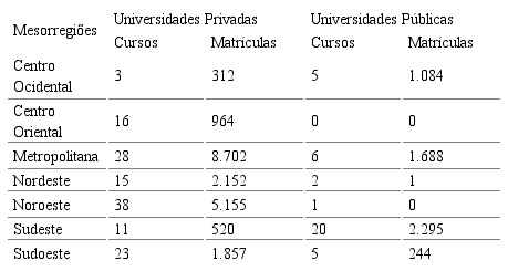 As tabelas anteriores indicam a distribuição não uniforme entre cursos e matrículas nas sete mesorregiões do estado para os anos de 2000 e 2007. Nestes casos, o maior número de cursos encontrava-se na mesorregião Noroeste, ao passo que o maior número de matrículas estava na mesorregião Metropolitana.