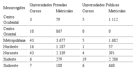 Nas universidades públicas, a maior concentração de matrículas nos três cursos pesquisados se manteve na mesorregião Sudeste, com 36,12% do total; e o menor percentual se concentrou na mesorregião Nordeste, com 0,93%. A mesorregião Noroeste não apresentou alunos matriculados em Matemática e a mesorregião Centro Oriental não apresentou alunos matriculados em nenhum dos três cursos. Nas universidades privadas, de um total de 8.616 matrículas, 42,68% se concentravam na mesorregião Metropolitana e 0,92% na mesorregião Centro Ocidental.