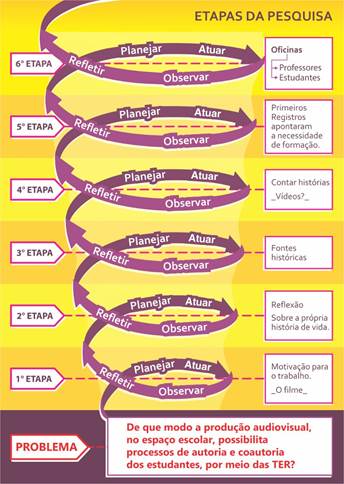 Para tanto, o método adotado neste estudo, a Pesquisa-Ação, Kemmis (1988) propõe as etapas a serem realizadas em uma espiral reflexiva, onde cada ciclo compreende as etapas de planejar, atuar, observar e refletir sobre o processo, sucessivamente, propondo novas ações, a partir da reflexão do ciclo anterior. Portanto, a partir do objetivo de pesquisa deste estudo, foram propostas etapas distintas, que serão apresentadas a seguir: