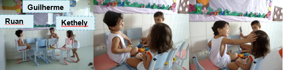 Um outro aspecto a ser considerado no episódio é que apesar de aceitarem a presença de dois pais na brincadeira de papéis, Ruan e Kethely não incluem Guilherme no decorrer da sequência de ações. Este fato pode ser percebido no momento em que Guilherme vê Ruan e Kethyle deitados no chão, encontra Cristofer e começa a brincar com ele, deitando-se no chão, propondo uma nova situação de brincadeira. Entretanto, Cristofer declara ser amigo de Ruan e Kethely e isto faz que que Guilherme se irrite, tome o brinquedo e empurre-o, abandonando o espaço da brincadeira. É possível inferir neste contexto a incompreensão quanto às definições de papéis do “segundo pai”, levando Guilherme a desistir da brincadeira.