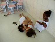 Ruan abraça Kethely. Ela olha para Ruan e eles se abraçam. Sibele à margem da brincadeira, observa os dois por um tempo. Ruan e Kethyle levantam-se. Kethely vai em direção a casinha pegar a boneca e uma toalhinha. Ruan acompanha Kethely. A menina enrola a boneca com a toalhinha enquanto caminha pela sala. Ruan acompanha e sorri.