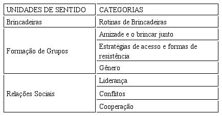Para fins de construção de dados, também foram extraídas fotografias sequenciadas dos vídeos, através de um programa de computador de domínio público, disponível na internet, chamado Free Vídeo To JPG Converter. A geração dos dados baseou-se na combinação entre reflexões produzidas pela análise das transcrições dos vídeos, de releituras das notas de campo e também por meio das fotografias empreendidas. Os dados produzidos foram agrupados em unidades de sentido, resultando nas categorias apresentadas no quadro a seguir: