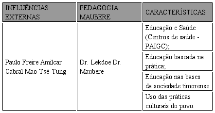 Em síntese, é possível afirmar, que as três influências externas ao país asiático, tiveram grande papel nas escolas populares de saúde (TABELA 01): Paulo Freire em relação a uso de práticas culturais do povo, materializados nos conhecimentos locais; Mao Tsé-Tung referente à educação realizada diretamente nas bases da sociedade timorense, sendo os civis integrantes das escolas; e por último, a influência de Amilcar Cabral acerca das escolas de saúde realizadas em contexto semelhante ao de Timor, no continente africano.