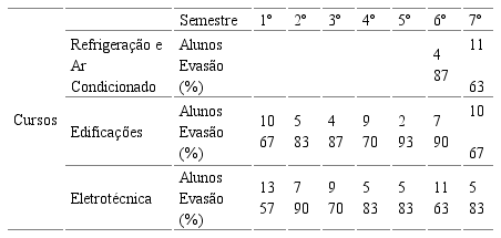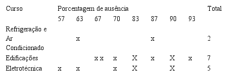 Construiu-se a Tabela 1 para melhor representar os dados, na qual foram colocados os semestres, números de alunos por semestres e a porcentagem de ausentes na época da coleta de dados, novembro de 2012. A maior ausência foi verificada no quinto semestre do curso de Edificações, com 93 %. A segunda maior ausência foi verificada no sexto semestre de Edificações e segundo de Eletrotécnica, com 90 %. A terceira foi verificada no sexto semestre de Refrigeração e Ar Condicionado e quarto semestre de Edificações, com 87 %. A quarta foi verificada no segundo semestre de Edificações e quarto semestre de Eletrotécnica. A quinta foi verificada no quarto semestre de Edificações e terceiro semestre de Eletrotécnica, com 70%. A sexta foi verificada no primeiro e no sétimo semestres de Edificações, com 67 %. A sétima foi verificada no sétimo semestre de Refrigeração e Ar condicionado e sexto semestre de Eletrotécnica, com 63 % e a oitava maior ausência foi verificada no primeiro semestre de Eletrotécnica, com 57 %.