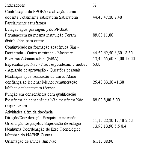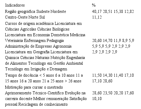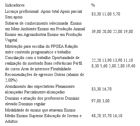 O questionário foi elaborado em função da necessidade de se atingir os objetivos desta pesquisa, e para isso foram estabelecidos os seguintes indicadores: região geográfica de procedência do mestrando; formação acadêmica; tempo de docência; subárea de conhecimento selecionada; motivação que levou o egresso a cursar pós-graduação em nível de mestrado; motivos que levaram à escolha do PPGEA; atendimento das expectativas de formação dos mestrandos; lotação do egresso após passagem pelo PPGEA; continuidade na formação acadêmica; licença profissional para cursar o mestrado; contribuição do PPGEA para a atuação como docente; domínio e atualização dos professores do PPGEA; mudanças ocorridas após a conclusão do curso; função no Instituto Federal em consonância com a sua qualificação profissional; modalidade de ensino que atuam; atividades que desenvolve além das atividades de docência; estímulo à produção científica após o mestrado; publicação sobre sua dissertação em periódicos, livros ou outros; participação em eventos; e, orientação de alunos em iniciação científica.