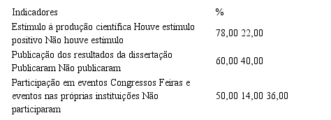 Sobre o estímulo à produção científica após a realização do mestrado, 78,00% dos entrevistados alegaram esse positivamente (Quadro 4), mencionando o envolvimento em projetos, publicações, e melhora na capacidade interpretativa de projetos. A maior parte daqueles que responderam negativamente declarou não se sentirem incentivados ou não terem tempo para dedicação. Estevam, em 2007, analisando egressos de mestrado em Educação, constatou que a falta de produção científica provinha da necessidade desses sujeitos em aliar trabalho, pesquisa e coleta de dados em curto espaço de tempo, além da falta de incentivo e do baixo valor das bolsas, que desestimulavam os indivíduos a deixarem seus vínculos empregatícios e consequentemente sua remuneração, para se dedicarem mais à pesquisa. Certamente, neste estudo, concordamos com esse autor, quando mencionou que seriam estes os fatores cruciais de entrave nessa direção.