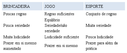 Portanto, enquanto categoria ontológica atribui-se ao jogo uma centralidade justaposta, assim como as características que comumente lhes são atribuídas, muitas das quais, pelos autores mencionados. A centralidade justaposta admite que as características do jogo podem se acentuar ou reduzir, mantendo o objeto jogo, embora possa também considerar um novo objeto, como não-jogo. Nesse caso, será trabalhado aqui somente com dois objetos: a brincadeira[7] e o esporte, ambos mantendo as características apresentadas, ora com ampliação, ora com redução.