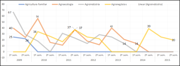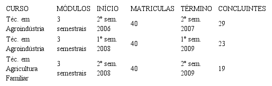 Observa-se a decadência enfrentada pela área agrícola na oferta dos cursos da área, sendo que a evasão e o número de concluintes sempre foi baixa, em comparação ao número de matrículas, que incialmente sempre são de quarenta estudantes.