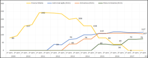 No ano de 2017, a ETEC de Piedade passou a não mais oferecer turmas de ensino médio regular. Fica evidente o aumento do número de estudantes nos cursos técnicos integrados ao médio em Administração e Alimentos, os quais estão consolidados. O curso Técnico em Meio Ambiente vem também se consolidando e apresentando um número de estudantes em crescente evolução. O curso Técnico em Administração Integrado ao Ensino Médio será caracterizado de forma específica mais adiante, haja vista ser este o foco desta pesquisa. O Gráfico 5, demonstra a evolução do número de estudantes da ETEC de Piedade, desde sua criação até o ano de 2018.