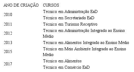 Os dois primeiro oferecidos foram o técnico em Administração e o técnico em Secretariado. Ambos ofertados logo em 2009, prolongando-se durante os próximos anos com cinco turmas sequenciais e ininterruptas que se seguiram até o ano de 2016. O curso Técnico em Secretariado, que também teve início em 2009, conduziu-se até o ano de 2015, com quatro turmas sequenciais.