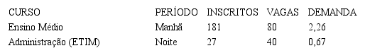 Para a primeira oferta do curso, não houve formação de demanda de turma para a realização do processo do Vestibulinho para o curso Técnico de Administração Integrado ao Ensino Médio (ETIM)[6], pois o número de inscritos foi inferior ao número de vagas ofertadas.