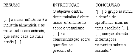 No Quadro 4, que trata especificamente do veganismo, a preocupação dos estudantes e autores foi enfaticamente as questões de preconceitos e a dificuldade de pessoas que adotam esta postura alimentar, de não terem oferta para sua subsistência nesta situação.