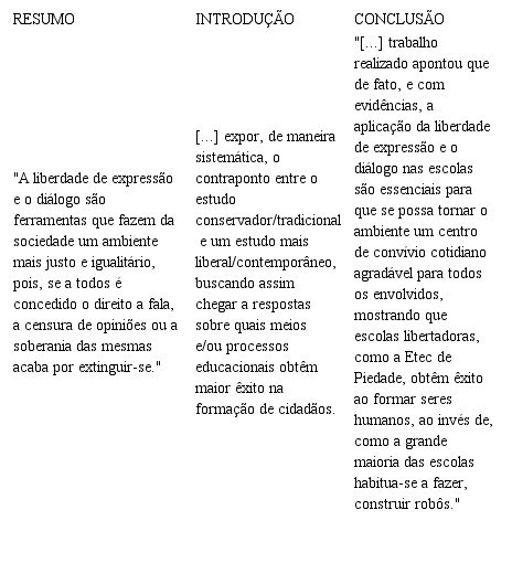 No próximo quadro, observa-se uma abordagem de questões relacionadas a liberdade de expressão no ambiente estudantil, delineada pelas autoras. Demonstram uma relação que as estudantes distinguem, quando comparada por elas, as estruturas educacionais pregressas, com suas experiências anteriores em comparação ao objeto de estudo deste TCC, no qual abordou a própria ETEC de Piedade. Percebe-se ainda, claramente a importância por elas dadas, por meio de sua pesquisa de TCC, que os espaços de diálogos são fundamentais em todos os níveis educacionais, porém o jovem necessita destes espaços para suas manifestações de caráter típico juvenil. Demonstram grande apreço pelo que encontraram, por meio da pesquisa, porém ainda, pela experimentação de uma nova experiência educativa.