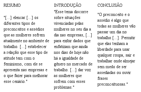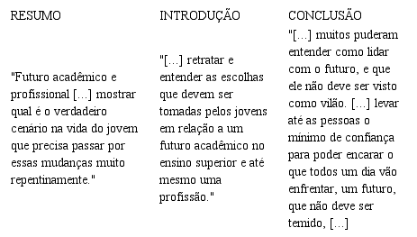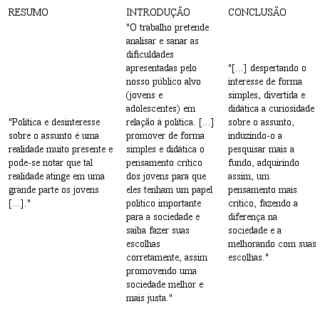Dentre as análises dos trabalhos, oferece-se nos quadros abaixo de forma sistematiza, as seções como o resumo, a introdução e as conclusões destes TCC, o que, em excertos extraídos destas seções, observam-se preocupações sociais tratadas pelos autores dos trabalhos.