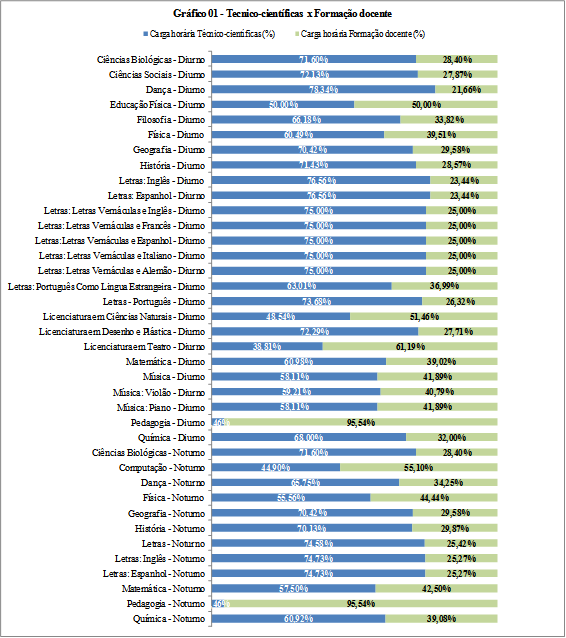 No Gráfico 1, é possível identificar que na formação docente, que contemplam os fundamentos epistemológicos, sociológicos, psicológicos, às didáticas e metodologias, práticas de ensino, estágios curriculares e trabalhos de conclusão de curso, o curso que apresentou expressiva carga horária foi o de Pedagogia do noturno e diurno (95,54% da carga horária total), seguido de Teatro (61,19%), Computação (55,1%), Ciências Naturais (51,46%) e Educação Física (50%). Os cursos que apresentaram menor carga horária nesse grupo foram os de Dança, diurno (21,66%) e os de Letras (entre 23 e 25%), com exceção do curso de Letras como língua estrangeira – Português que apresentou 36,99% da carga horária obrigatória de formação docente.