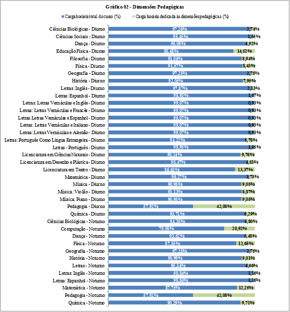Conforme representado no Gráfico 02, verifica-se que apenas o curso de Computação está cumprindo a carga horária mínima para as dimensões pedagógicas. O curso de Pedagogia, que deveria apresentar predominância de carga horária dessa dimensão, atualmente oferta 42,08% da carga horária total. Seguindo em ordem decrescente, os cursos de Computação (20,92%), Educação Física (14,52%), Teatro (13,37%) e Física noturno (12,65) foram os que apresentaram maior concentração da dimensão pedagógica ofertada. O curso que apresenta menor carga horária de dimensão pedagógica foi o de Letras (variando entre 0,93 e 4,66%), com exceção de Letras como segunda língua – Português (5,78%), Ciências Sociais (1,55%), Ciências Biológicas diurno (2,74%), Geografia noturno e diurno (2,75%), Matemática diurno (3,73%) – enquanto o noturno ofertou (12,25%).
