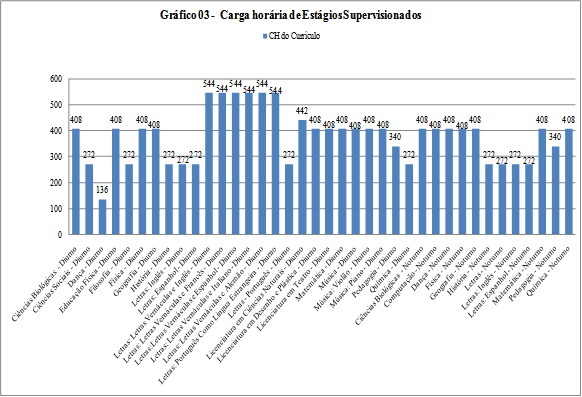 Os 14 que não estão cumprindo são: Pedagogia (noturno e diurno), Ciências Sociais, Dança (diurno), Filosofia, História (diurno e noturno), Letras Inglês (noturno e diurno), Letras Espanhol (noturno e diurno), Letras Português (noturno e diurno) e Química (diurno). Os cursos e suas respectivas horas de estágio estão demonstrados no gráfico 3 abaixo:
