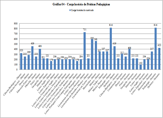 É com base na constatação da importância desse conjunto de conhecimentos que esse estudo se propôs a analisar a carga horária destinada à formação docente. Para tanto, foi necessário isolar e analisar a carga horária de estágios curriculares, de práticas pedagógicas, de dimensão pedagógica, de técnico-científicas e a soma dos componentes que correspondem à formação docente.