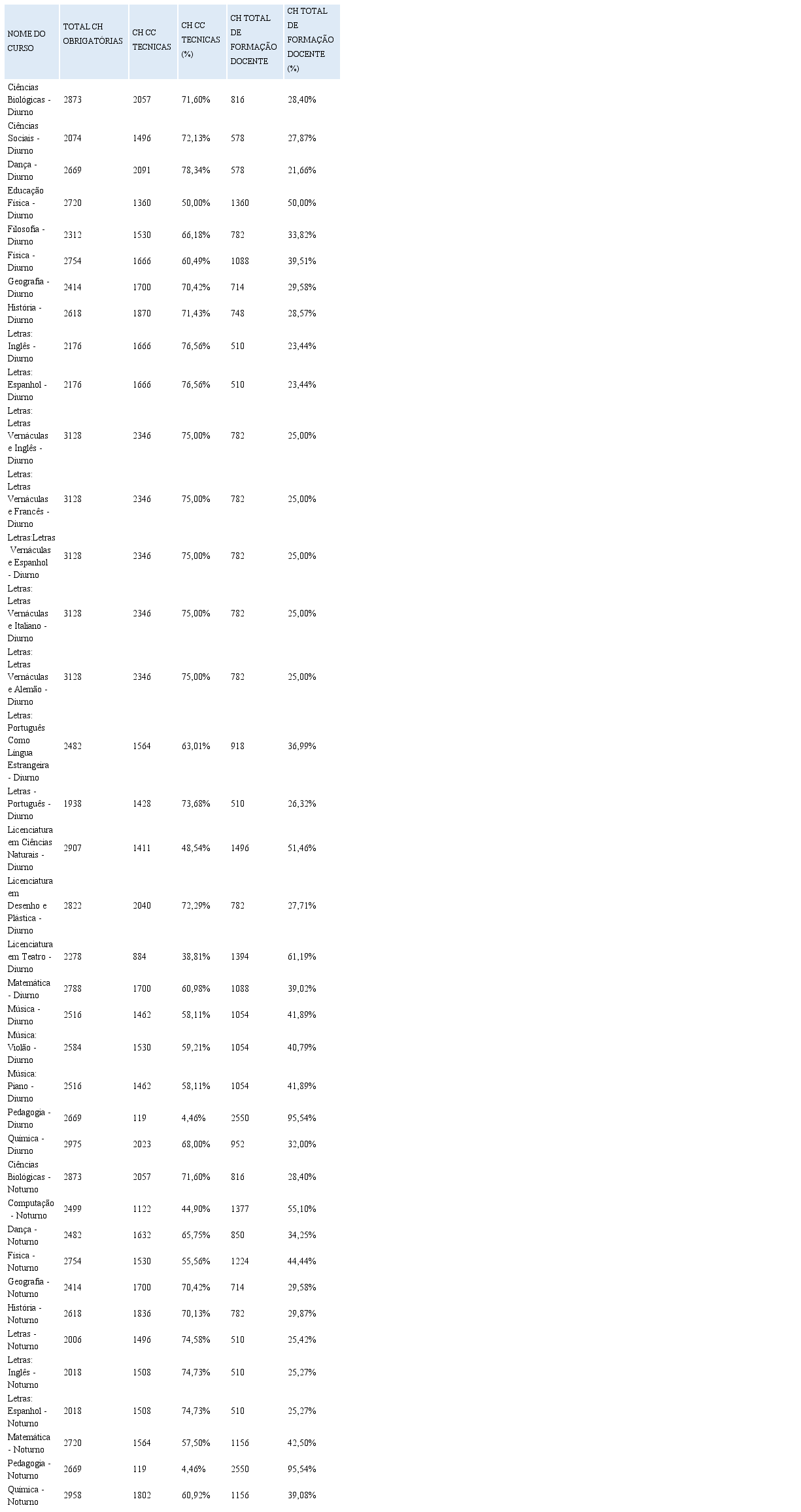Essa autora também aponta que mesmo as disciplinas que se enquadram como formação docente, se caracterizam predominantemente como teóricas e não práticas, quando deveria haver um equilíbrio entre esses dois eixos. No nosso estudo, apenas os cursos de Educação Física, Ciências Naturais, Teatro e Física (noturno) conseguiram obter um equilíbrio idealizado entre a carga horária de formação técnica e de formação docente.