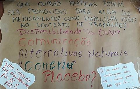 As perguntas geradoras foram: O que pode substituir a medicação? Que outras práticas podem ser promovidas para além do medicamento? Como viabilizar a substituição da farmacoterapia no contexto de trabalho? O painel mural produzido está na Figura 1. O debate aportou: disponibilidade para ouvir, comunicação, alternativas naturais, correrio e placebo. Foram trazidas ainda duas mensagens ou frases poéticas para decorar o painel: “Não sabendo que era impossível, foi lá e fez” e “Se as coisas são inatingíveis, ora, não é motivo para não querê-las”. Vê-se uma compreensão ou inscrição de “possíveis”. Inscrevem o “correrio” (houve um debate se a palavra não seria “correria”) e o “placebo”, logo após os enunciados de “disponibilidade para ouvir” e “comunicação”. Se o placebo representa a busca pelo efeito, sem as consequências ou danos dos medicamentos ou mesmo pela eventual ausência de prescrição prévia, o correrio é o investimento na escuta e busca de medidas necessárias: encaminhar relatórios ao juizado, conseguir o horário de novo julgamento/avaliação, conseguir atendimento com a psicóloga, conseguir cela na ala de medidas mais brandas, enfim, “correr atrás” da melhor socioeducação (ou humanização), “é aquele correrio, não uma correria”.