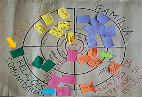 A residente de pedagogia apresenta a proposta adaptada do modelo GAM e constrói, com o grupo de jovens participantes das rodas de conversa, o mapa dos “círculos em rede” (Figura 3): no centro a pessoa se coloca e deve pensar nos componentes que a rodeiam: amizade, família, comunidade, sistemas de saúde e trabalho ou estudo, imaginando a proximidade e distanciamento dos elementos (quanto mais próximo de si, mais próximo do centro, e vice-versa):
