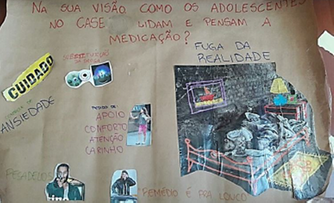 Num outro painel da Educação Permanente em Saúde com os trabalhadores, percebemos uma preciosidade na figura resultante a uma nova pergunta geradora: “na visão dos trabalhadores, como os jovens pensam a medicação?” A pergunta remetia a um colocar-se na dimensão do outro – o jovem – deslocar e descolar-se de si, para se pensar como o jovem, como o interno. Olhemos para a imagem maior colada no painel mural (Figura 4), essa acompanhada do descritor “Fuga da realidade”. Esse ponto apareceu muito na voz dos trabalhadores, tomando este como um dos principais motivos da solicitação por medicamentos realizada pelos jovens. Os trabalhadores estavam dizendo que a “hipermedicação” era solicitada pelos jovens, a fim de “fugirem da realidade”. Alguns trabalhadores confirmam que a fuga pelo medicamento é sim para suportar o espaço da internação, outros trouxeram a ideia de uma fuga da realidade de sua própria história/vida ou da infração cometida. Esclarecem que se está no prontuário um “se necessário”, a medicação pode ser administrada, caso contrário não há o que fazer. Segundo o pessoal técnico em enfermagem, às vezes acontece de quem precisa não querer e de quem não precisa querer usar. Anotamos: “às vezes eu sei que aquele guri não precisa de remédio, mas o psiquiatra deu, o que vou fazer? Eu não tenho formação pra isso”. “É difícil, porque o médico vê o guri só no horário marcado, a gente tá com ele todo dia”.