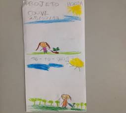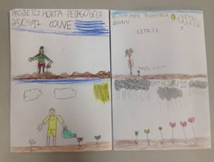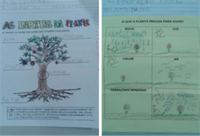 Foi sugerido também a abordagem de como eram separadas as plantas em partes, e que esse conhecimento fosse construído com os alunos. As professoras realizaram alguns exercícios sobre os temas de clima e solo dentro das disciplinas, foram lidos textos clima e solicitada a criação de desenhos, demonstrando o entendimento sobre os mesmos (Figura 5). Desmond et al. (2002) enfatizam que um modelo de horta/jardim em uma escola necessita do envolvimento interdisciplinar.