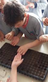 Foram semeadas por volta de 70 unidades de espécies como, tomate cereja, rúcula, alface, coentro, cenoura e repolho. Na atividade foi utilizado adubo produzido na compostagem realizada no terceiro encontro.