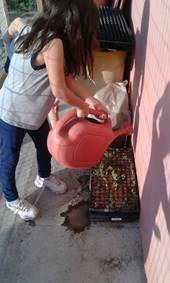 Cada grupo, nos dias que sucederam ao processo de semeadura, realizou, em revezamento, a rega da sementeira (Figura 7), onde puderam acompanhar o desenvolvimento das plantas. Foi possível constatar o envolvimento de todos, sendo perceptível que compreenderam a necessidade de colaboração para a realização dos objetivos.