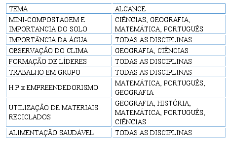 Os temas apresentados e discutidos foram: alimentação saudável, importância da água e do clima, ações que integram a HP ao empreendedorismo, correlação de matemática e ciência da Terra, além de traçar estratégias para a formação de líderes e a necessidade de cooperação no trabalho em grupo. Também foi discutido o planejamento para se trabalhar esses temas interdisciplinarmente no currículo do 1º ano de ensino fundamental.