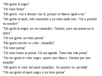 En la clase P5, durante la manifestación espontánea, aproximadamente la mitad de los niños, es decir, 12 niños se manifestaron entre los cuales 5 niños dijeron que les gustaba y 7 dijeron que no les gustaba el ninot (Gráfico 2). Como los ninots eran diferentes, algunos niños tomaron un ninot, incluso sin poder elegir, que cumplió con sus expectativas con respecto al color y las condiciones físicas. La razón presentada por los niños a los que no les gustó su ninot fue la ausencia de pierna, brazo o porque era negro (Cuadro 1). Después del primer momento de contacto con el ninot, algunos niños comenzaron a interactuar con él, pintando y jugando con el ninot. Una niña que no había aceptado el ninot negro, porque su brazo estaba roto, durante el proyecto finalmente aceptó su ninot sin brazo.