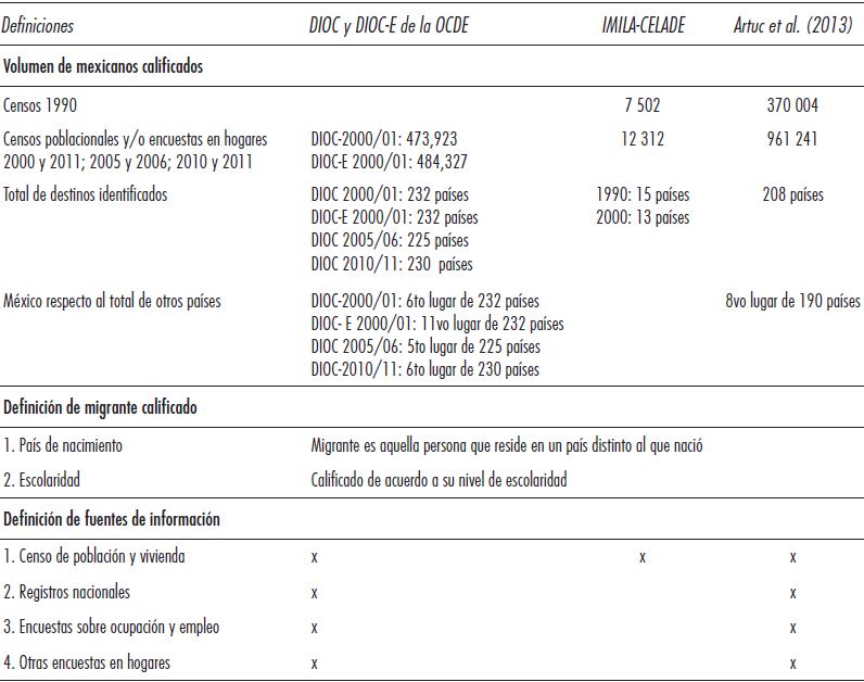 Las tres fuentes del cuadro 1 definen a un migrante calificado a “aquella persona que reside en un país distinto al que nació, con cierto nivel de escolaridad”. Para la OCDE con estudios terciarios, para IMILA con 10 años de escolaridad o más y para Artuc et al. (2015) con estudios universitarios o más. El reto operacional de esta definición recae en las distintas maneras en que cada país recaba la información, por ejemplo, algunos países no cuentan con la pregunta de país de nacimiento, pero incluyen país de nacionalidad o de ciudadanía, que es distinto al país de nacimiento (véase cuadro 1).
