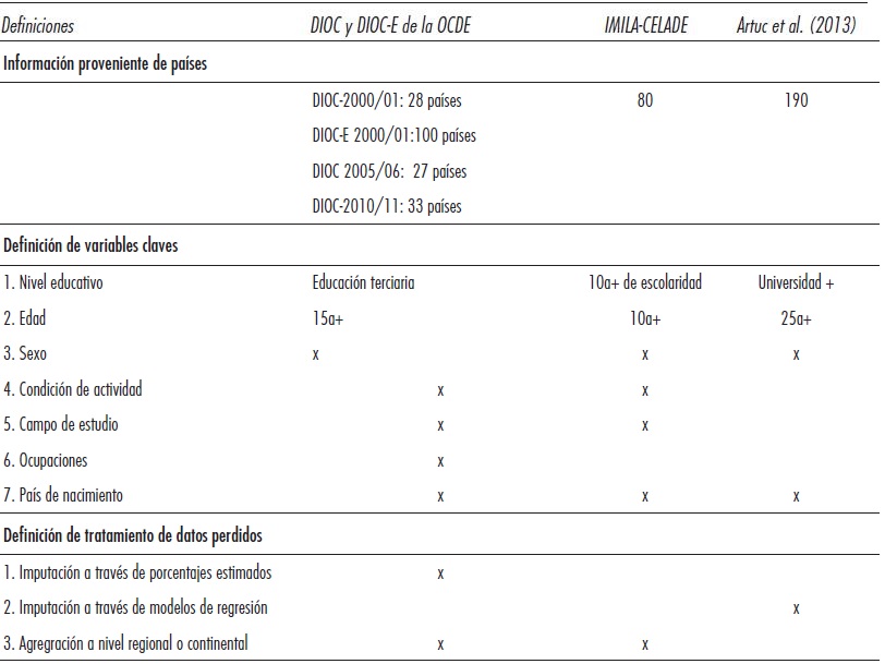 El primer proyecto lo lleva a cabo la OCDE. El proyecto recopila información sobre inmigrantes en los países miembros (DIOC, por sus siglas en inglés)3 y, para países no miembros (DIOC-E). La información de la DIOC ha sido compilada por la OCDE con apoyo de la oficina de estadísticas de cada país; empero, cuando esto no es así, recurre a la información disponible en IPUMS-Internacional a cargo de Minnesota Population Center, al Eurostat y a los datos disponibles en IMILA-CELADE. La versión de 2000 incluye información para 28 países miembros y la versión 2010 para 34 países de la OCDE sobre la población de 15 años y más, el nivel educativo, sexo, ocupación, duración de la estancia y otras variables socioeconómicas según el país de nacimiento. Para mayor detalle de la metodología y definición de variables se puede consultar OCDE (2008) y Artuc et al. (2015).