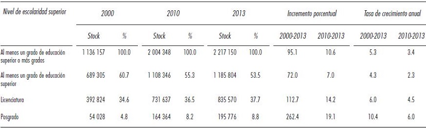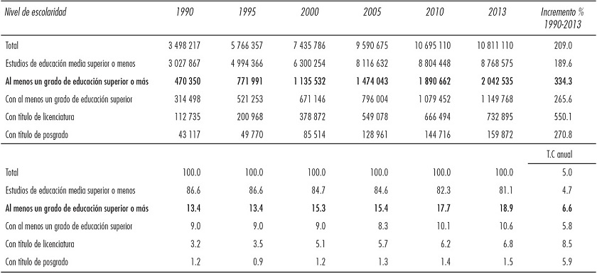 La población que cuenta con título de educación superior de nivel licenciatura y posgrado, ascendió en 2013 a 13.6 millones y representa el 16.2% de la población total con esos niveles de escolaridad; los migrantes mexicanos participan con el 6.5% que en términos absolutos equivale a 893 mil, cifra que en 1990 era de 156 mil inmigrantes mexicanos, a partir de entonces esta población se ha incrementado de manera constante, entre 1990-2000 aumentó más de tres veces su tamaño y entre 2000-2013 casi se duplicó al pasar de 464 mil en 2000 a 893 mil en 2013 (véase cuadro 3).