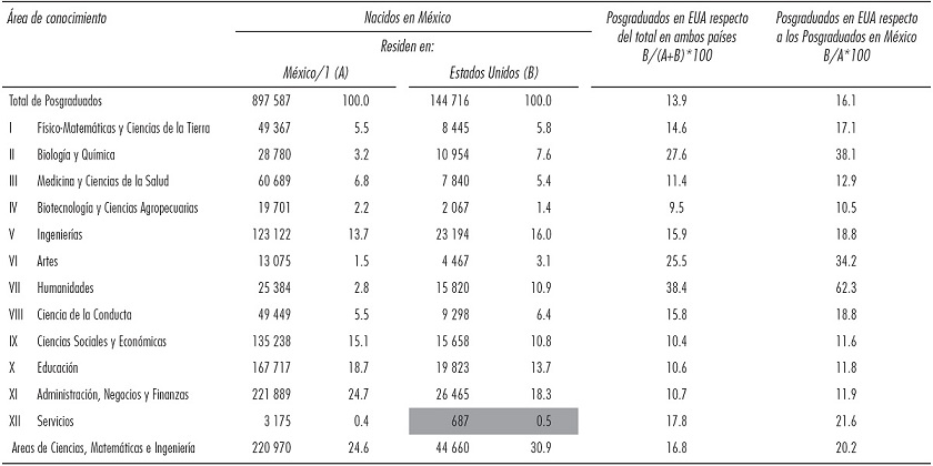 En el cuadro 4 se presenta información sobre la población nacida en México con estudios de posgrado que capta el Censo de Población y Vivienda 2010 (CPV, 2010) para los que residen en México y, la que registra la ACS 2010 para los residentes en Estados Unidos por área de conocimiento. En el año 2010 había 898 mil connacionales con un título de posgrado en México y en Estados Unidos 145 mil; en conjunto esta población sumaba poco más de un millón y representaba el 86.1% del total de posgraduados mexicanos nacidos en el país. El peso relativo de los posgraduados mexicanos en Estados Unidos respecto de los que residen en México es de 16%.
