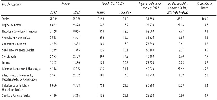 En 2013 (ACS, 2011-2013), el mayor porcentaje de mexicanos con posgrado en Estados Unidos se empleó en ocupaciones de Educación, Formación y Bibliotecología (25.2%), seguido Gestión (24.7%) y Profesionales de la Salud y Ocupaciones Técnicas (14.4%). De acuerdo con las proyecciones de empleos para 2022 estas ocupaciones experimentarán un incremento del 11.1%, 7.2 y 21.5%, respectivamente. De los mexicanos con posgrado que pertenecen al campo de la Ciencia y la Ingeniería (49 mil) el 19.8% logra emplearse en una ocupación STEM, aunque el restante 80.2% se emplea en otro tipo de actividad profesional (véase cuadro 6).