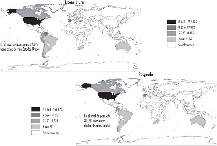 Los mexicanos con posgrado tienen como destinos principales: Estados Unidos, España, Suiza, Canadá y Colombia, los cuatro primeros países con un desarrollo humano muy elevado, tres de los cuales se encuentra entre los cinco países mejor clasificados en cuanto a desarrollo humano.5 Para los mexicanos con estudios de licenciatura se constata una mayor diversificación de los destinos y su importancia numérica, de manera similar a los posgraduados una mayor proporción de licenciados tiene como destinos países desarrollados (véase mapa 1).