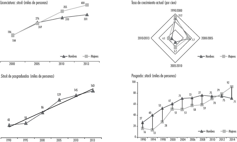 Los migrantes con altos niveles de escolaridad, especialización, experiencia y acumulación de conocimientos constituyen una masa crítica fundamental para generar innovación, aumentar la productividad y el crecimiento económico y, por lo tanto, para promover el desarrollo del país. La población nacida en México con estudios de posgrado que reside en Estados Unidos se incrementó en términos porcentuales entre 1990-2013 en 271%, ya que prácticamente se triplicó. Este subgrupo al igual que el de profesionistas experimentó el mayor dinamismo durante periodo de observación. Creció a una tasa media anual de 7.1% entre 1990-2000 y entre 2000-2013 al 4.9% anual, al pasar de 43 a 86 mil durante el primer periodo hasta situarse en 160 mil personas, 13 años después (véanse cuadro 3 y gráfica 1).